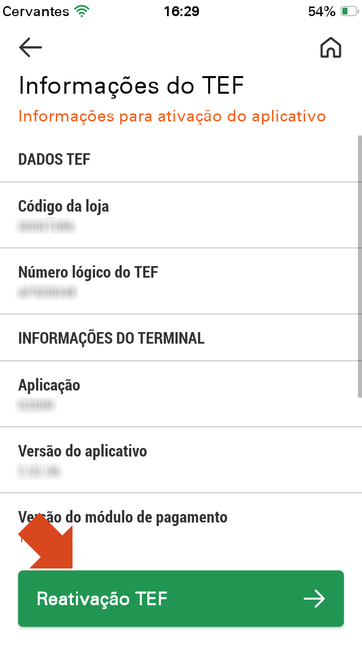 8. Na tela de "Informações do TEF" pode aparecer o botão Cadastro TEF ou Reativação TEF, clique conforme aparece no seu dispositivo.