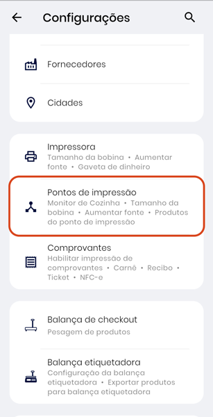 Quando o ponto de impressão estiver configurado, os pedidos serão enviados para ele, ou seja, na impressora de rede. Caso contrário, eles serão encaminhadas para a impressora conectada ao dispositivo.
